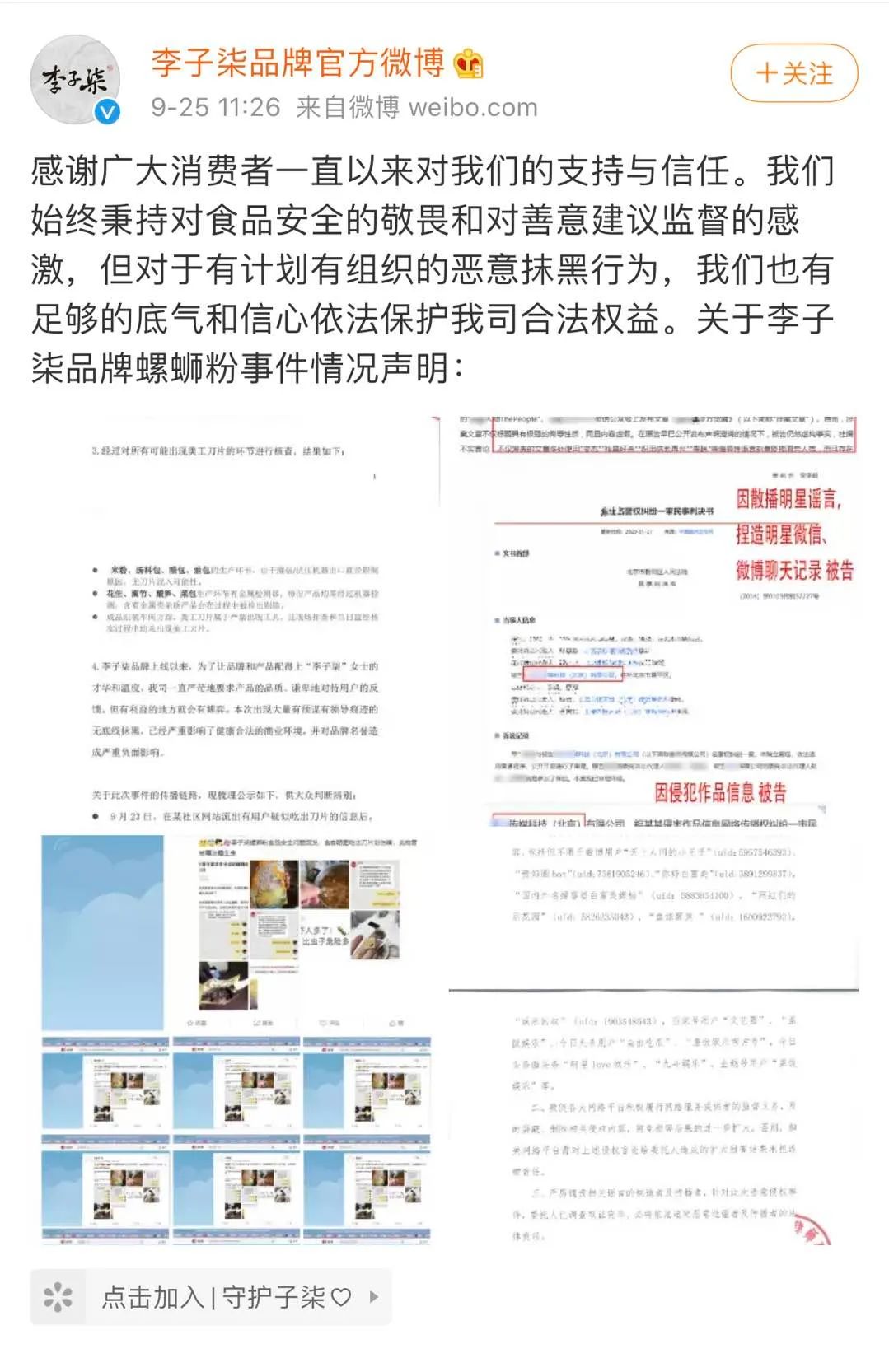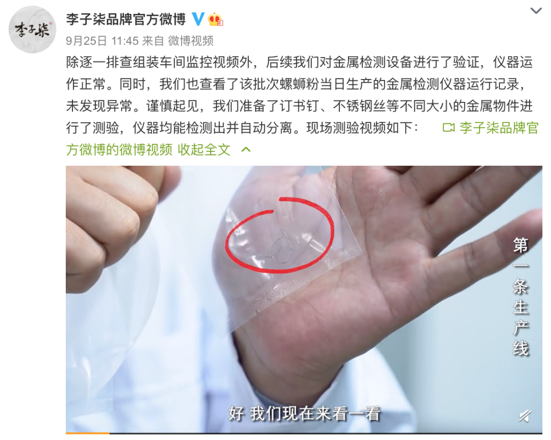 针对此事,李子柒品牌官方微博于9月25日发布声明回应,声明称杭州微念品牌管理有限公司(即李子柒品牌签约公司)在接到消费者反映后,第一时间调取了涉事批次螺蛳粉生产车间的所有视频资料。