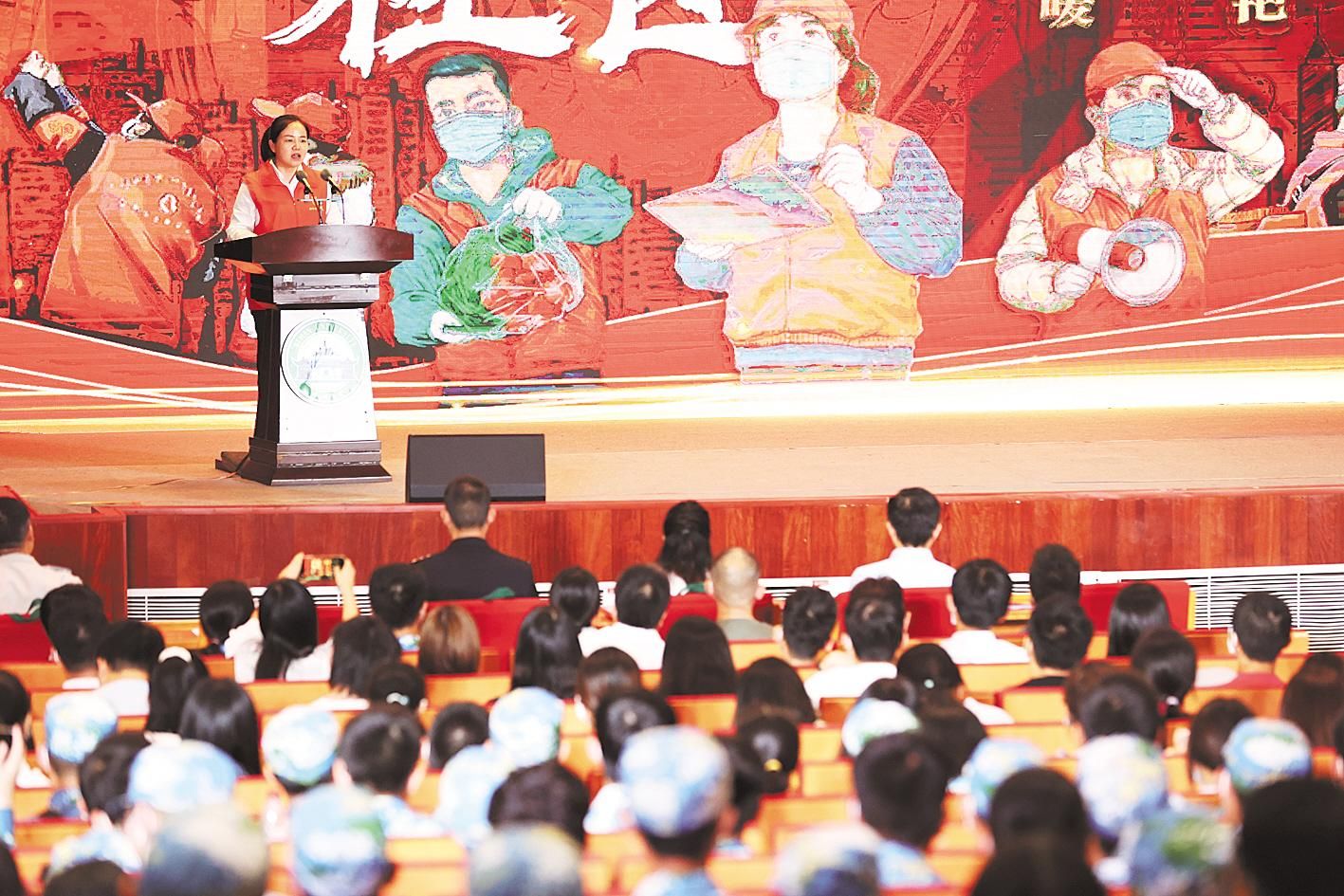9月28日,武汉大学人文科学馆,武汉市青山区工人村街青和居社区党总支书记桂小妹在作报告。(湖北日报全媒记者 柯皓 摄)