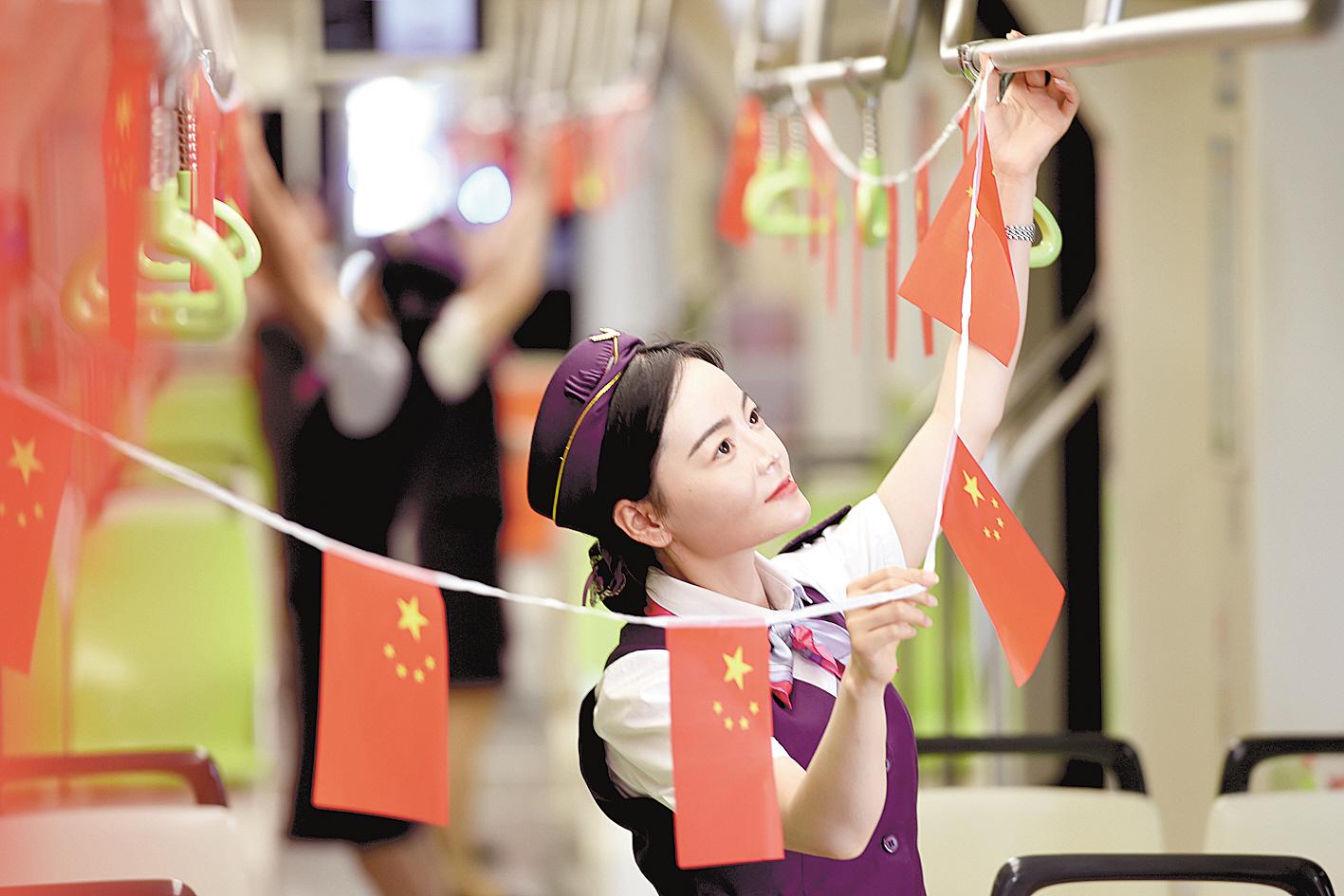 9月28日,武汉公交车都有轨电车T1线乘务员和驾驶员利用发车间隙,精心装扮有轨电车国庆主题车厢,一面面鲜艳的国旗悬挂在车厢醒目位置,激发广大市民的爱国热情,营造浓厚的国庆氛围。 (湖北日报全媒记者 李溪 摄)