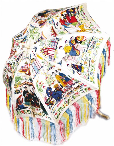 15世纪欧洲大航海时代打通了丝绸由中国直接传入欧美的通道。17-18世纪,随着东西方贸易愈渐频繁,在欧洲掀起了一股中国风,带有浓郁东方风情的中国丝织品深受欧洲贵族青睐。展厅里呈现了清代通过海上丝绸之路销往欧洲的丝绸产品,白缎地彩绣人物伞是其中的精品。这把阳伞为19世纪60-70年代所制,用料极其奢侈,以象牙为伞柄,五色网格丝线流苏为边饰,白缎地刺绣为伞面。伞骨将伞面分割成8块,每块自成画面,从中可以看到中国传统的吉祥图案、亭台楼阁、戏曲和神话故事等。伞顶装饰有象牙人物圆雕,是高鼻梁、白皮肤的西洋女子形象。这种中西合璧、个性鲜明的设计图案正是当时中国外销欧洲商品最明显的特征之一。