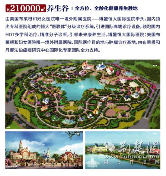 武汉恒大世纪梦幻城,位于武汉北·红安经济开发区,面积超2万亩,总投资约1600亿元。这是恒大继海南之后的第二个投资规模超千亿的项目。该项目定位为文化旅游综合体,集人居、娱乐、休闲、文化、旅游于一体,建成后将带动华中地区文化聚拢和旅游产业升级,成为华中地区极具创造力的世界文旅胜地。