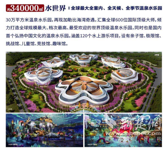 奇幻水世界:约34万㎡,设有亲子馆、极限馆、挑战馆、儿童馆、竞技馆、趣味营等,系全球最大全室内、全天候、全季节温泉水乐园。