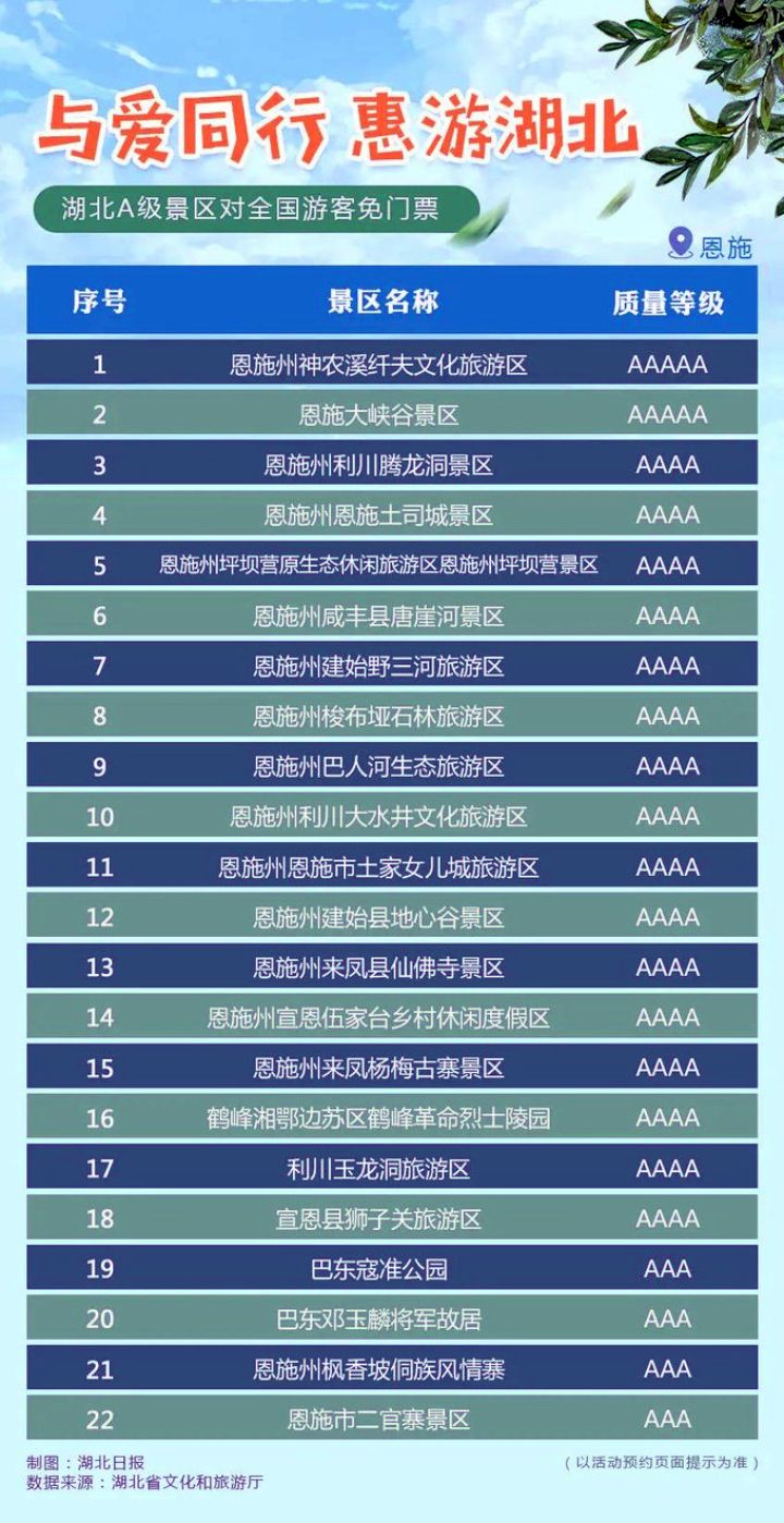 8月7日,湖北宣布实行“与爱同行 惠游湖北”活动,所有A级旅游景区对全国游客免门票开放,这其中也包含了恩施的22个A级景区。此项活动从2020年8月7日开始,一直持续到2020年年底,包括“十一”黄金周在内。全国疫情低风险地区游客,实名预约,测温、扫健康码后均可免门票进入该州所有A级景区。旅行社组团游客,同样也可以享受这个政策。