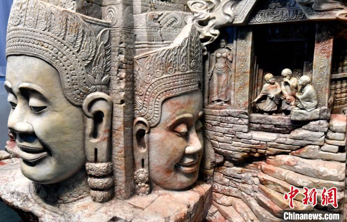 吴哥较有代表性的头像雕刻“高棉的微笑”、寺庙缩影等元素在该件作品得以一一呈现。 记者刘可耕 摄