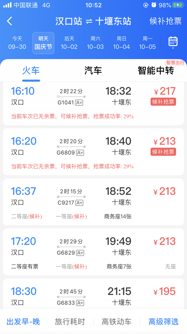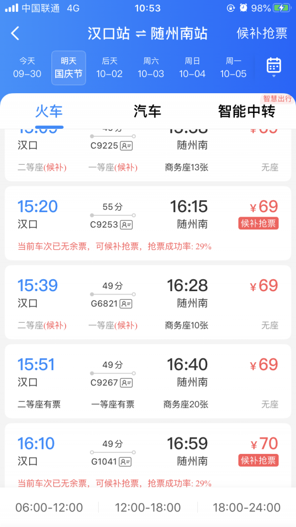 9月30日,长江网记者登录铁路官网查询,从汉口至十堰东的余票充足,上午和下午都还有不少余票;而从汉口至随州南,虽然上午的余票较少,但下午仍还有不少余票。乘客还可以候补抢票,抢票成功率约为30%,保障沿途站点的乘客都能买到票。