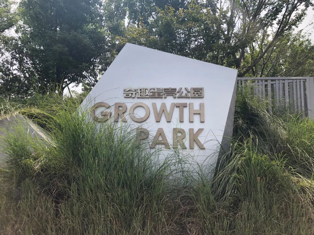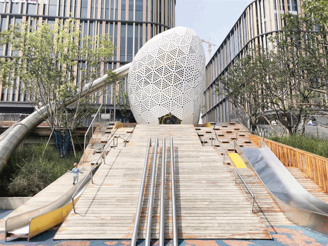 公园的庭前广场花香飘易,流水潺潺。这个公园真的像它的名字一样新奇有趣,一眼望去,有一横一竖两个“大蛋壳”——竖着的“蛋壳”进去是滑滑梯,横着的“蛋壳”里面是蹦床。还有造型特别的滑滑梯,小朋友可以选择攀爬上去。