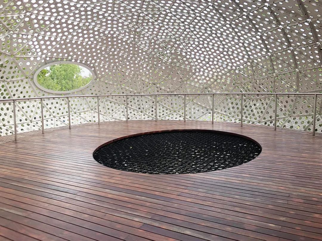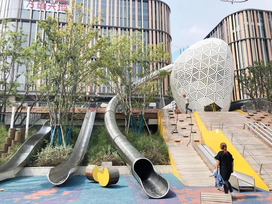 公园中间有一片空旷的广场,很适合小朋友玩滑板和平衡车。到了晚上,“蛋壳”会亮灯哦,彩色灯光映射在上面,仿佛有遇到UFO的感觉,保证小朋友们爱得不要不要的。