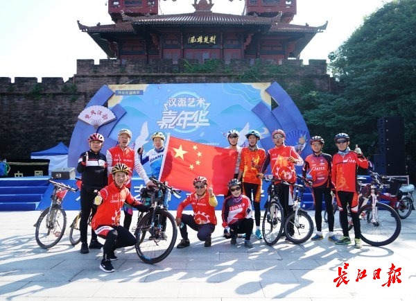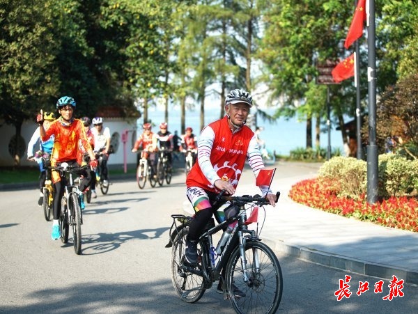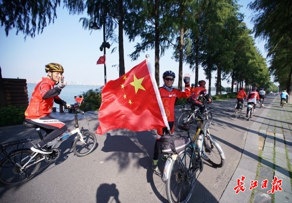 长江网10月1日讯10月1日国庆节,武汉市青山自行车协会的骑行爱好者们,在东湖绿道用骑行方式祝福祖国生日快乐!(记者何晓刚 摄影报道)