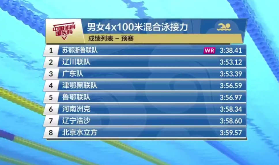 在刚刚结束的2020全国游泳冠军赛男女4x100米混合泳接力预赛中,由徐嘉余、闫子贝、张雨霏、杨浚瑄组成的苏鄂浙鲁联队,以3分38秒41的成绩打破了此前美国队保持的世界纪录(3分38秒56)!