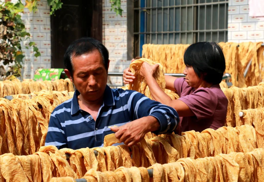 秋日,孙亚辉家的院子里铺满了金黄色的玉米,一批刚做好的豆皮挂在绳子上晾晒,还散着豆香。