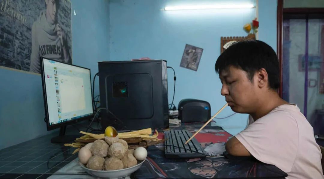 他坚持每天直播8个小时,用残臂滑动鼠标,用嘴含着筷子敲打键盘。他拒绝所有打赏,认真打包每一个包裹,用拼劲交出了一份异常给力的成绩单——