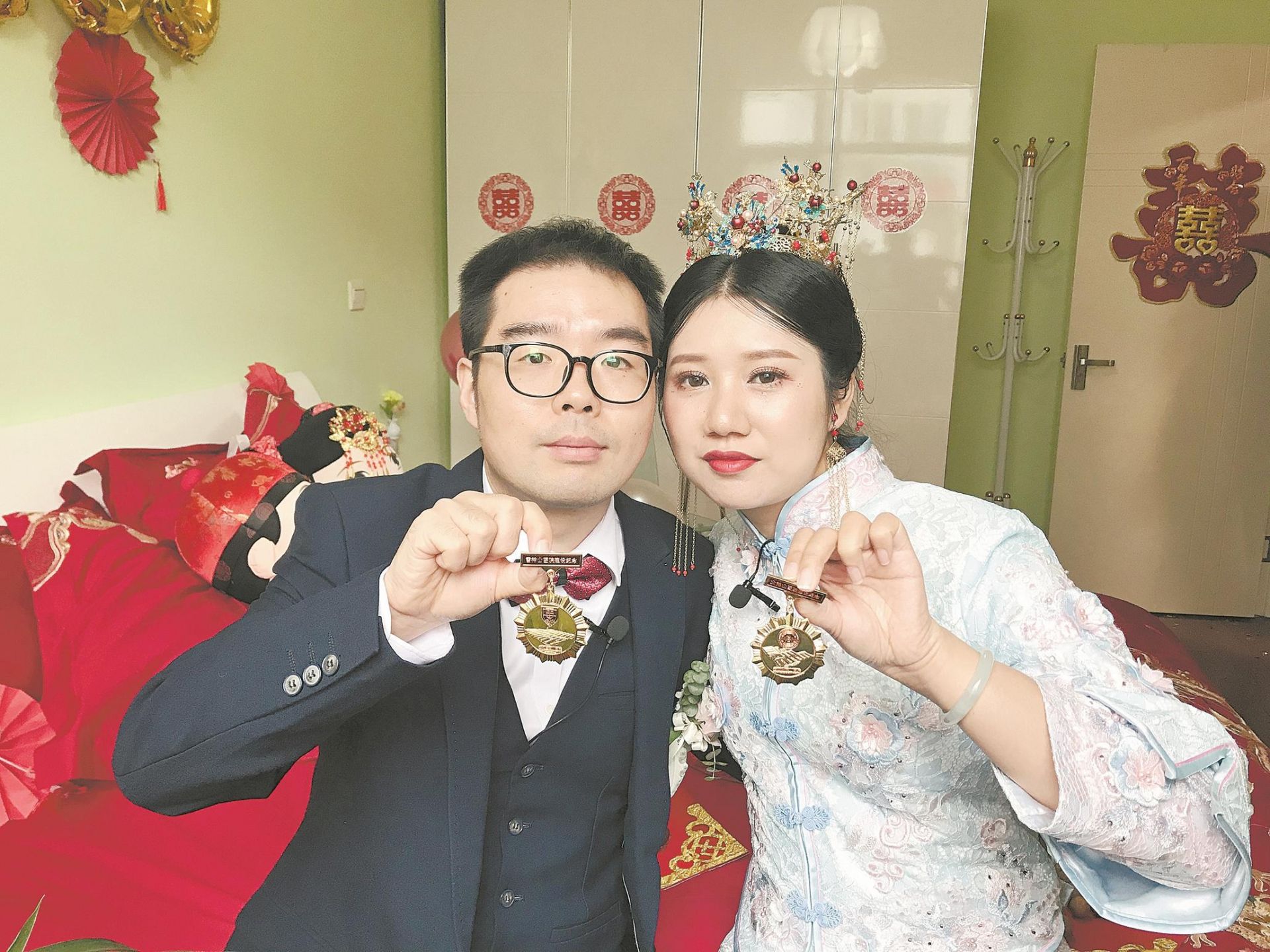 然而,承诺的婚礼并没有立马兑现。从雷神山医院回来后,袁绪强接受了14天的医学观察。“在那期间,他也没闲着,每天都在接打电话处理工作,能与我联系的时间非常少,想到他这么忙,我就主动提议将婚礼定在国庆。”邓姗姗对于“工作狂”丈夫更多的是理解和心疼。从2016年开始,两人一直都是异地恋,而邓姗姗也早已习惯了袁绪强的工作模式。袁绪强说:“做工程就是哪里需要去哪里,这些年与她聚少离多,非常感谢她的体谅。”