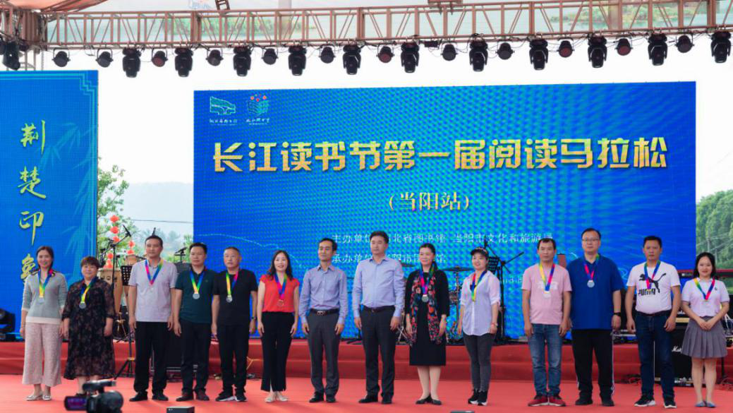长江读书节第一届阅读马拉松(当阳站)1+4项全部完成后,湖北省图书馆党委书记、馆长刘伟成和当阳市人民政府副市长刘伟为完赛代表颁发长江读书节第一届阅读马拉松完赛奖牌。其他完赛观众由当阳市图书馆统一在活动后分发完赛奖牌。
