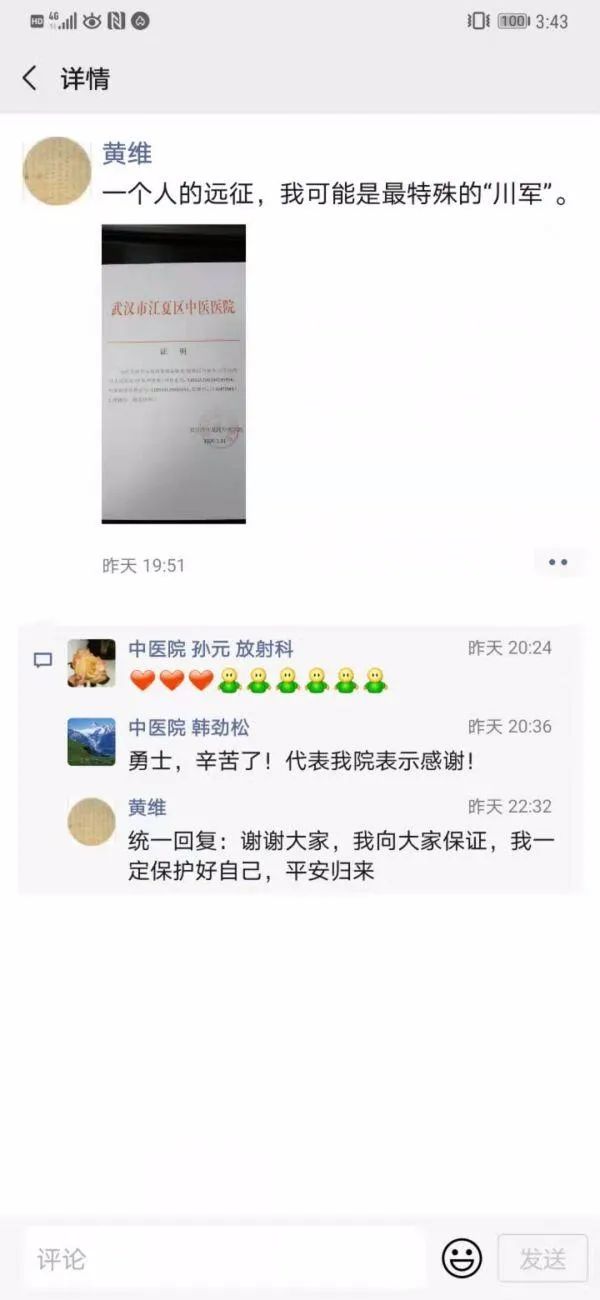1月31日晚,黄维医生发了一条朋友圈:“一个人的远征,我可能是最特殊的‘川军’。”