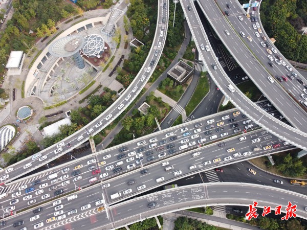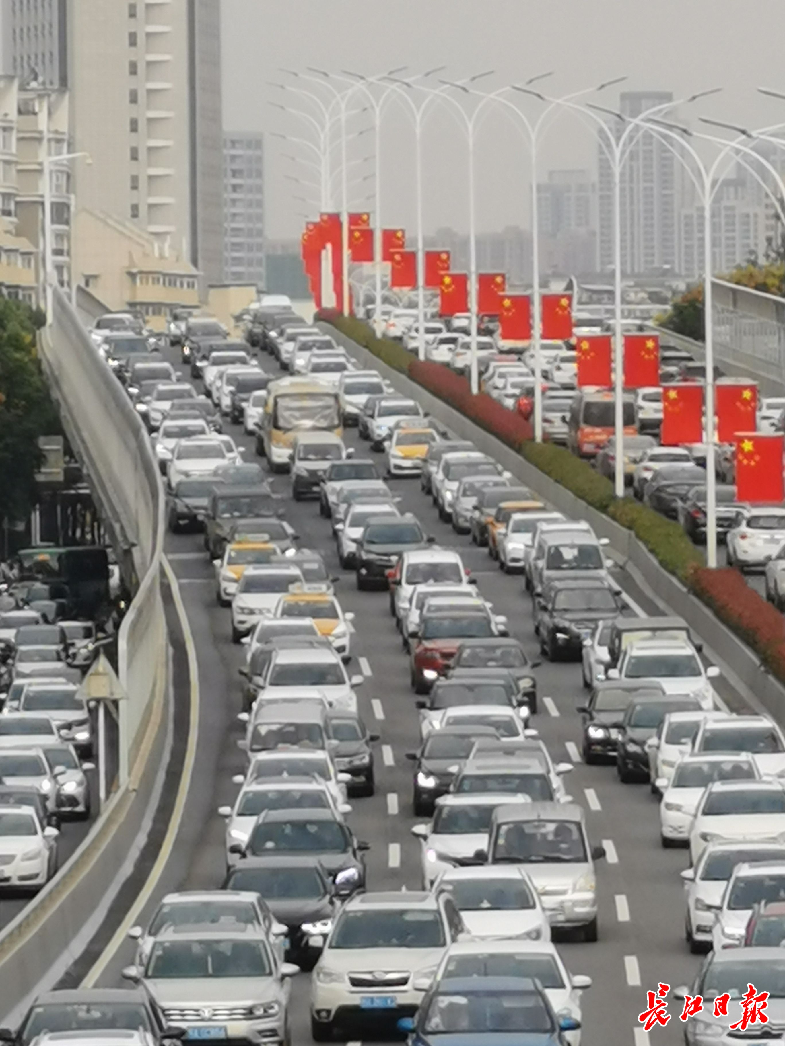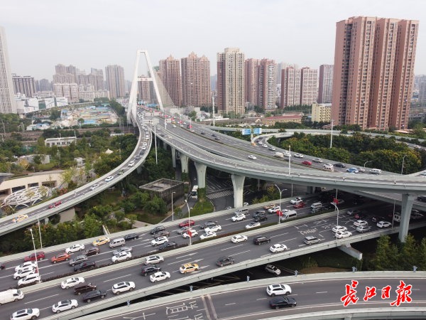武汉大道黄浦大街路口和二环线之间的立交桥上,车流比较拥堵。(记者杨涛 摄影报道)