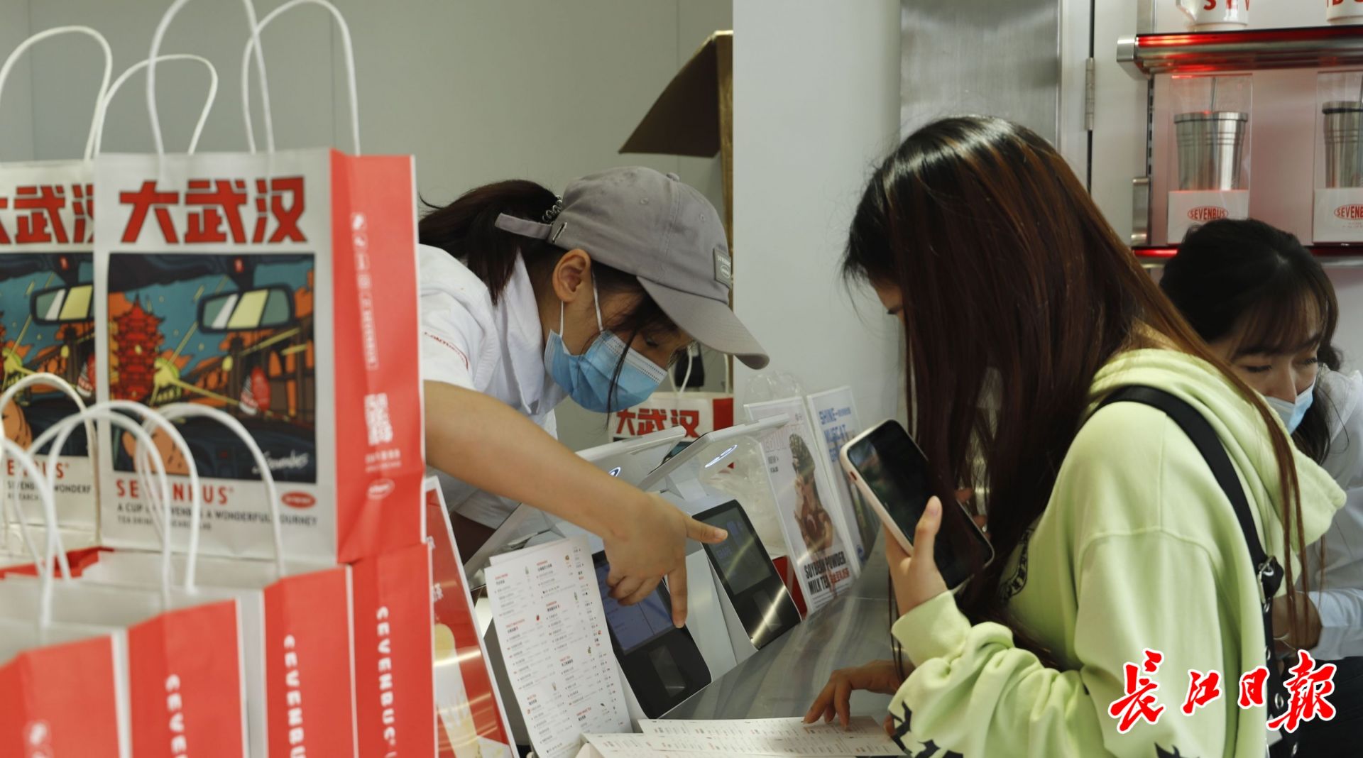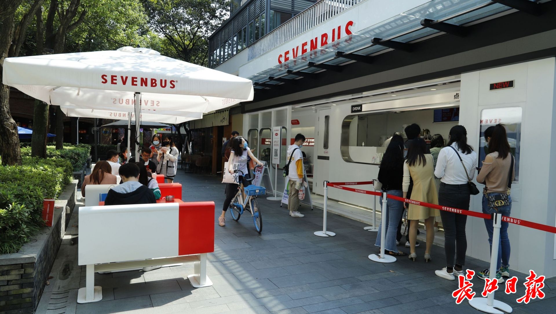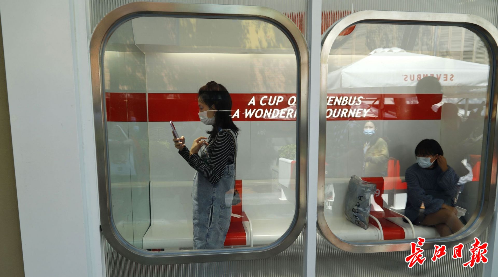 长江网10月10日讯 10月10日,武汉天地一家时尚茶饮店门口排起长队。这家国庆期间新开的店子,装修造型酷似一辆大巴车,吸引很多年轻人在这里拍照留念。(记者杨涛 摄影报道)