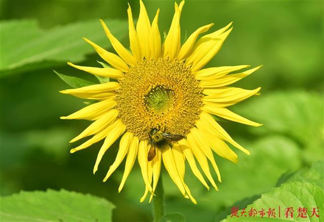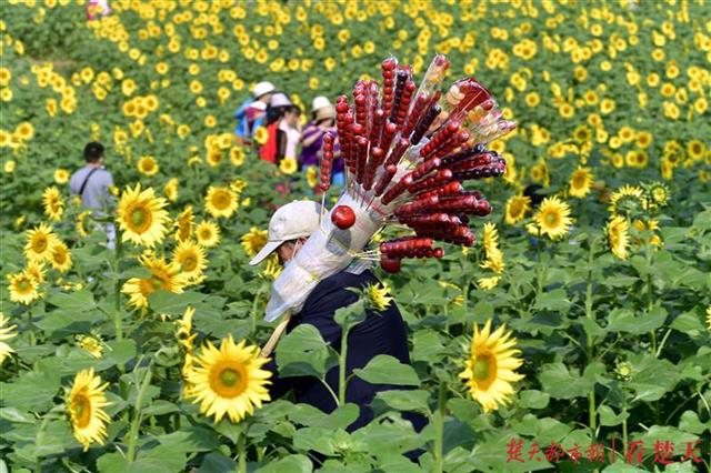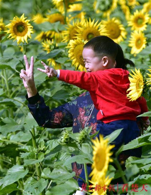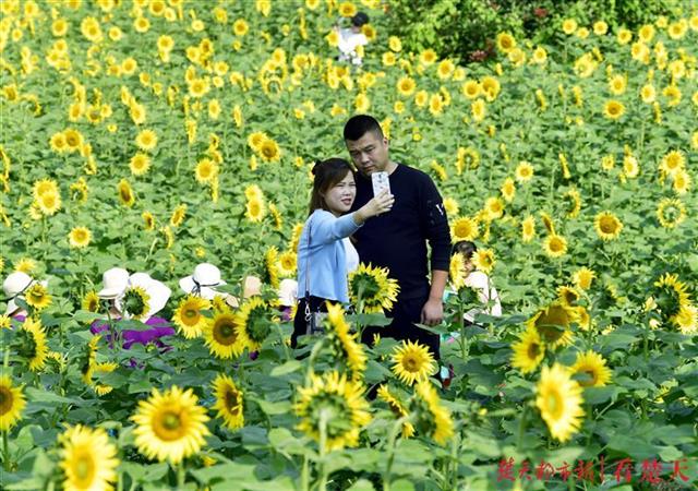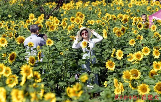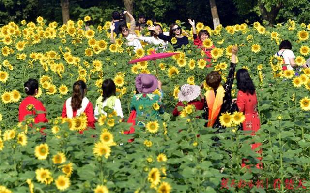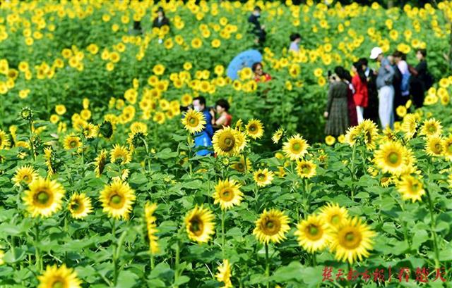 眼下的向日葵花色彩黄艳夺目,花型饱满,亭亭玉立于绿叶之上,在微风中攒动,尽显秋日无限活力,富有诗情画意,人们徜徉于花海之中,近距离感受大自然的美。