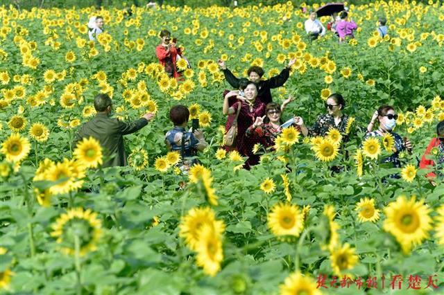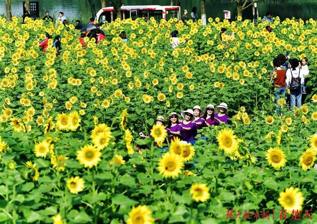 10月10日,武汉马鞍山森林公园十万株向日葵花正在争相绽放,已引来许多游客前来与向日葵花同框,打卡留念。