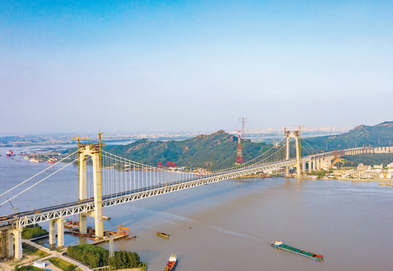 横跨长江镇江段的五峰山长江大桥位于润扬长江大桥和泰州长江大桥之间,是连镇铁路和京沪高速公路南延的关键控制性工程,也是全线施工难度最大的工程。大桥南北连接镇江市丹徒区与镇江新区,全长6409米,其中主跨1092米,采用单跨悬吊钢桁梁悬索结构,上层为双向8车道高速公路,设计时速100公里;下层为四线高速铁路(预留两线),设计时速250公里。