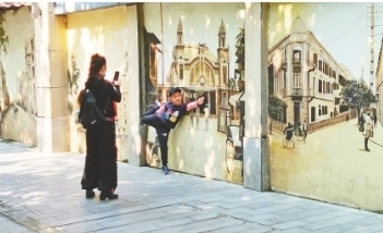 武汉晚报讯(记者杨荣峰)11日上午9点,阳光在中山大道一侧的墙面上留下斑驳树影。该处是江汉区楚宝片区的旧城改造区域。墙角下,传来“咔嚓”一声,豆豆扭着腰单脚踮立、眯眼躲着阳光的模样,被妈妈记录进了手机相册。豆豆的身后,是一面画着街景壁画的围墙。