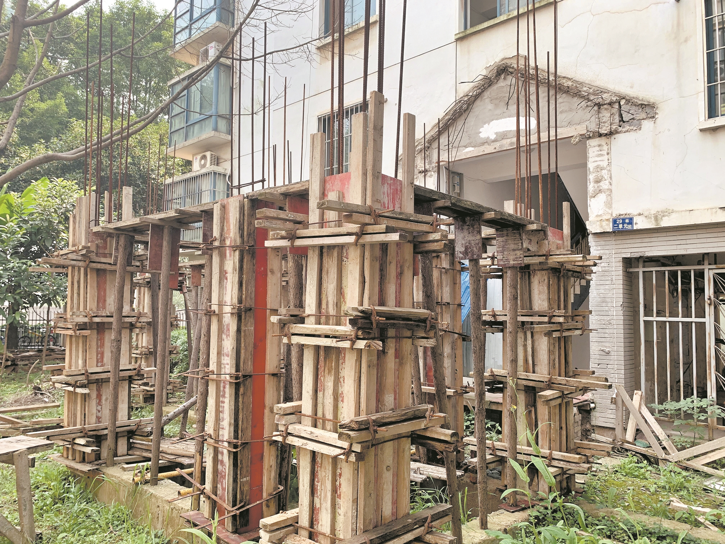 近日,楚天都市报记者来到喻园小区29栋。在60、61单元楼门口,加装电梯工程处于停工状态,电梯井框架已建好。29栋60单元一楼需要先步行半层楼梯才能入户。一楼的刘女士和护工慢慢搀扶着母亲回家。刘女士介绍,母亲今年85岁,患有中风,右半身偏瘫,长期坐轮椅,去医院看病非常困难。她和爱人在外地工作,逢年过节才回家。这次回来,带着母亲下楼透透气,希望电梯能尽快修好。