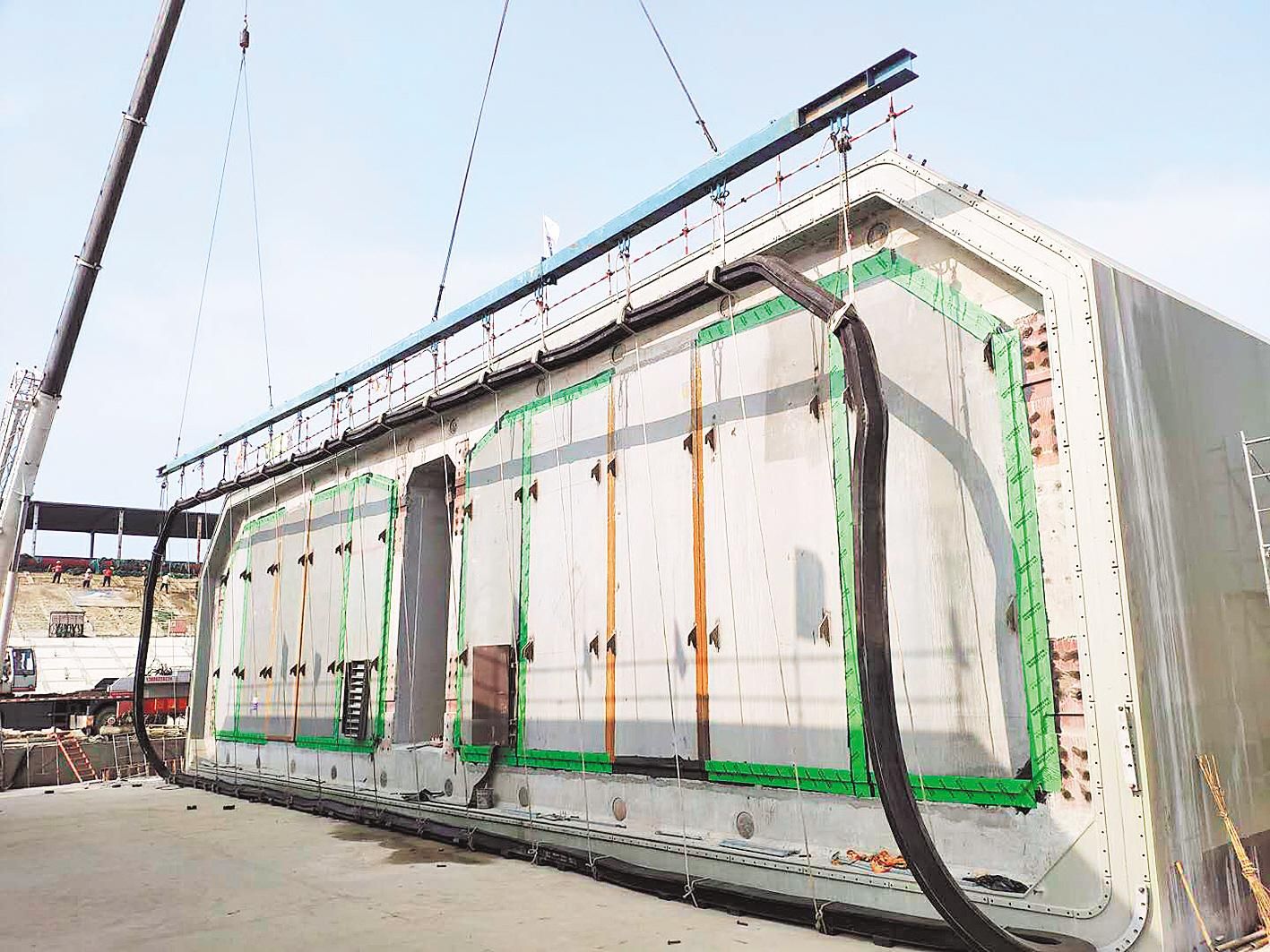 顺着他手指方向,一根黑色橡胶止水带出现眼前,像一根环形面条,吻合在沉管间接口处。孙晓伟介绍,一根止水带长75.52米,重4.2吨,起吊后需保证与沉管截面一致。为此,项目部设计专用吊具,并在止水带上设32个吊点,与沉管咬合时严丝合缝。下月,这艘“航空母舰”将沉入江底。