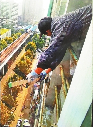 维修人员在外墙涂刷防水涂层。小区物业提供
