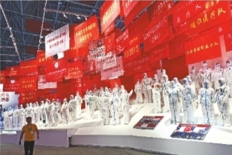 在“八方支援、共克时艰”展区,有专门为援鄂医疗队设计的一个展台,国家援鄂抗疫医疗队、江西省援鄂医疗队、中南大学湘雅医院国家医疗队等数十面援鄂医疗队的队旗在展厅上空飘扬。在这些珍贵的队旗上,还有曾逆行出征武汉的医护人员们的亲笔签名“中国加油”“武汉加油”等字样。