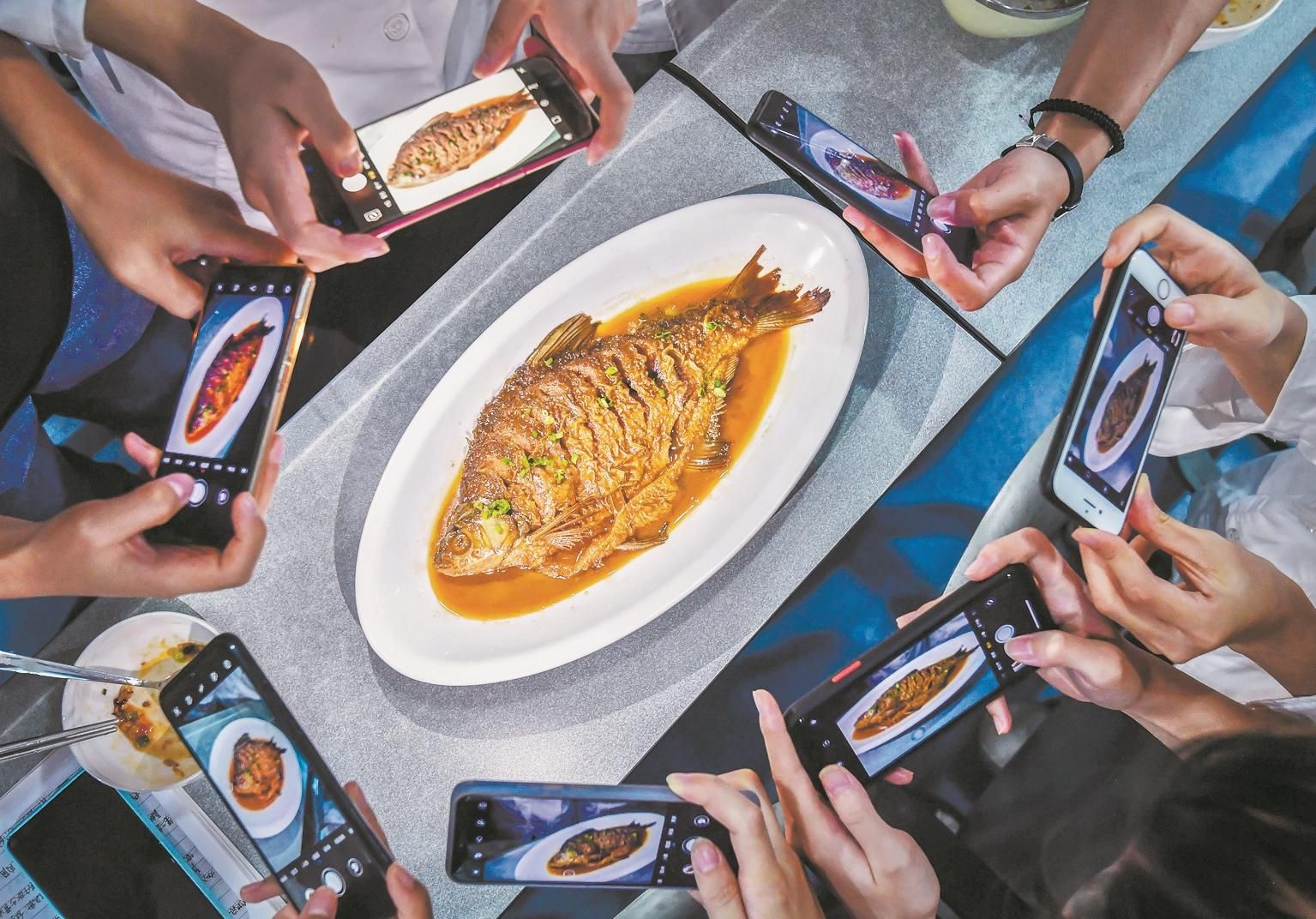 学生们争相用手机记录下这道色香味俱全的“红焖”武昌鱼