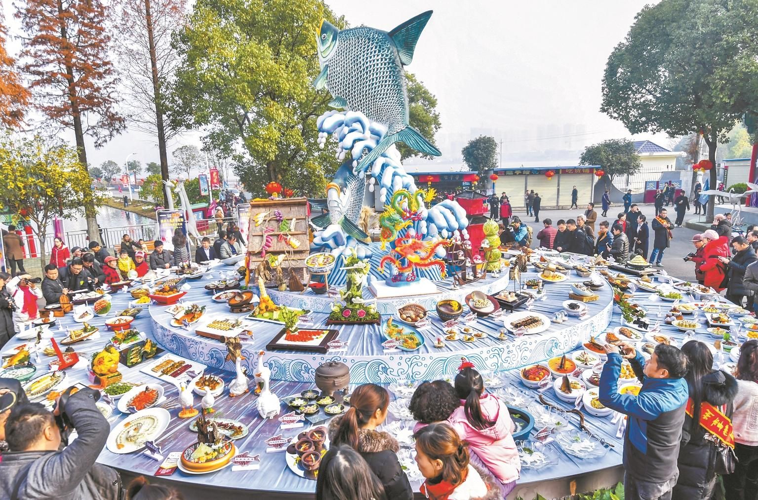 2018年12月16日湖北鄂州,在烹饪大师卢永良主持下,楚菜大师们一起烹饪出155道武昌鱼,此次“百味宴”创吉尼斯纪录