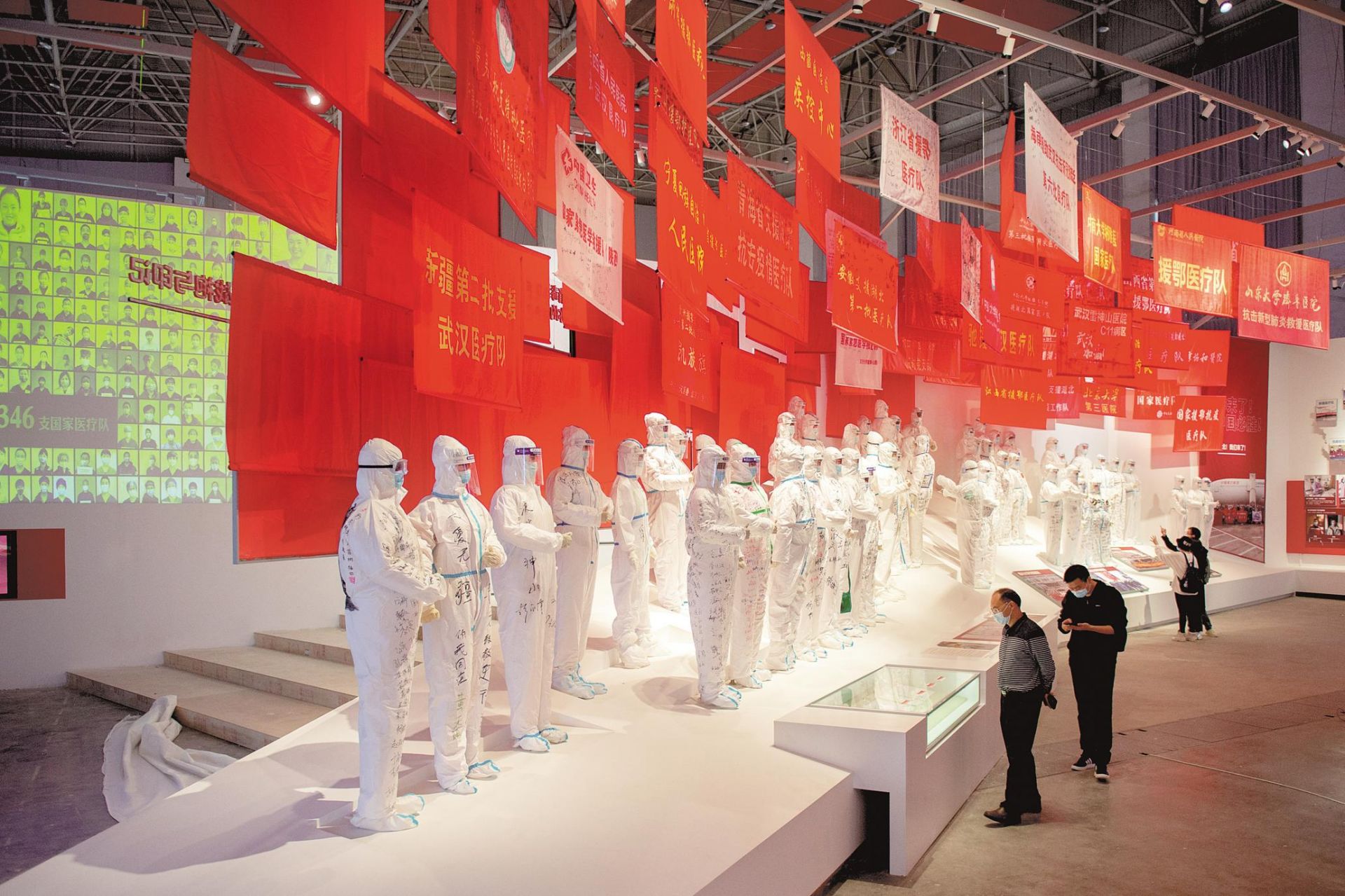 为增强感染力,展览精心设计制作“小区封控”“医护人员和解放军战士逆行出征”等30多处大型场景,配合光线设计、音效设置,营造立体展陈空间。