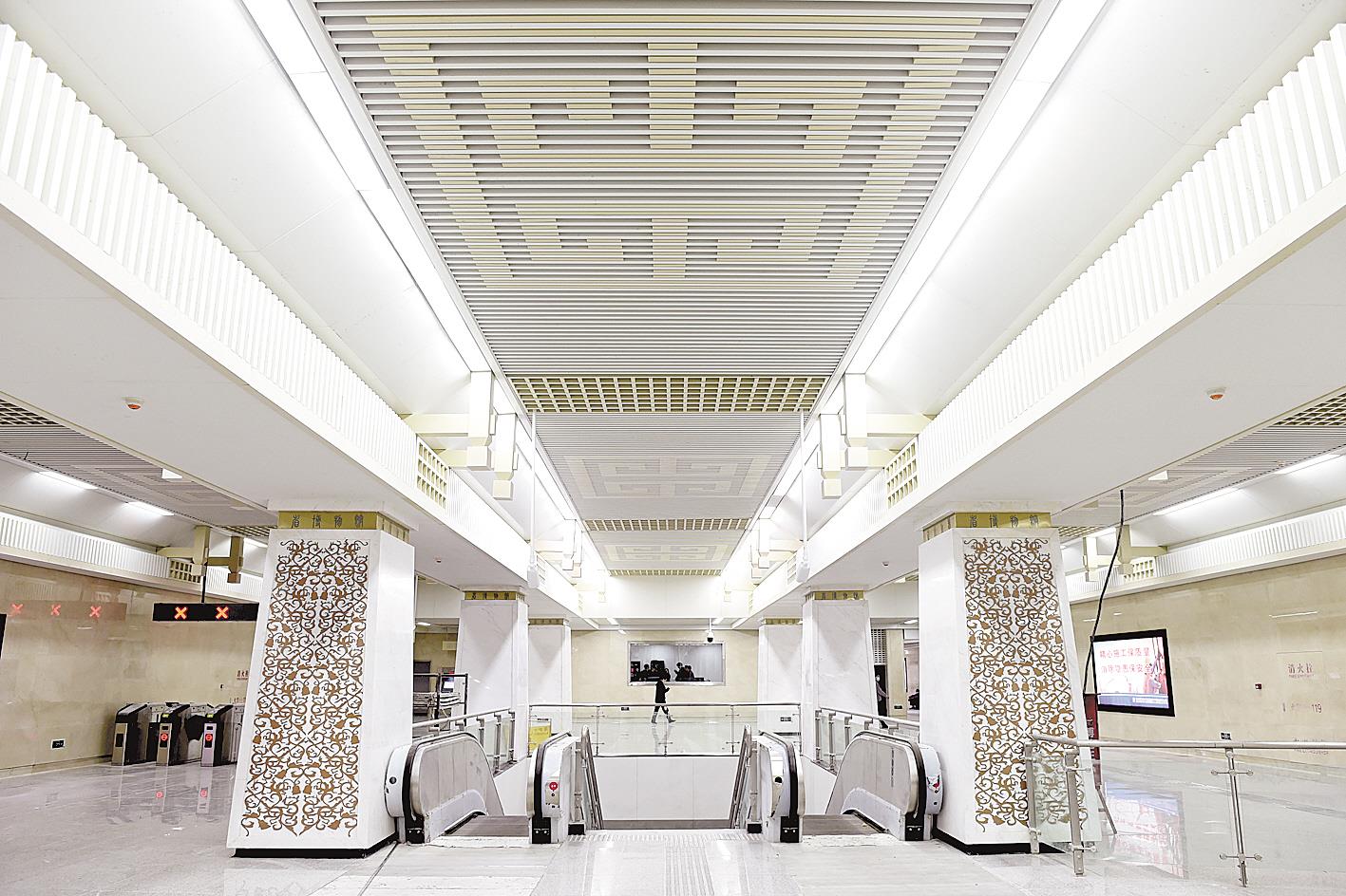 近日,武汉地铁8号线二期全线完成土建施工,12座车站主体结构全部完工。其中,四座特色艺术站之一的省博湖北日报站建成。该站以“楚文汉韵”为设计主题,在方案设计中通过发掘历史文化,提取楚文化的代表——“编钟金文”为元素,通过编钟上楚文形态,将楚文抽象化处理,重新组合成新的结构形态,以平面构成的手法图案与灯光相结合,以天花铝板方通等材质来表现。
