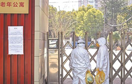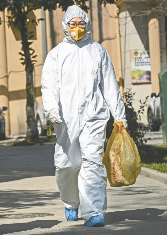 2月18日,龙飘身着防疫装备,在老旧小区寻找求助的患者,准备上门做治疗。