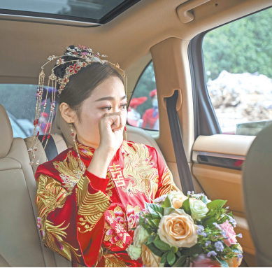龙飘坐上婚车,告别父母时忍不住掉下泪水。