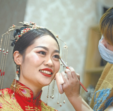 10月18日上午,周小龙在龙飘家中接亲。 10月18日凌晨5时,龙飘在老家汉川起床化妆。