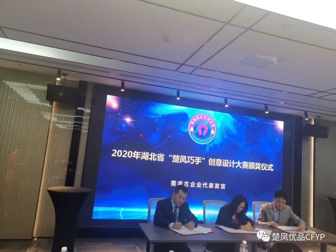 颁奖典礼上,获奖代表李建强、范一峰,企业需求代表吕运亚分别上台发表感言。此外,典礼上还进行了湖北工业大学“楚凤优品”设计基地签约仪式。