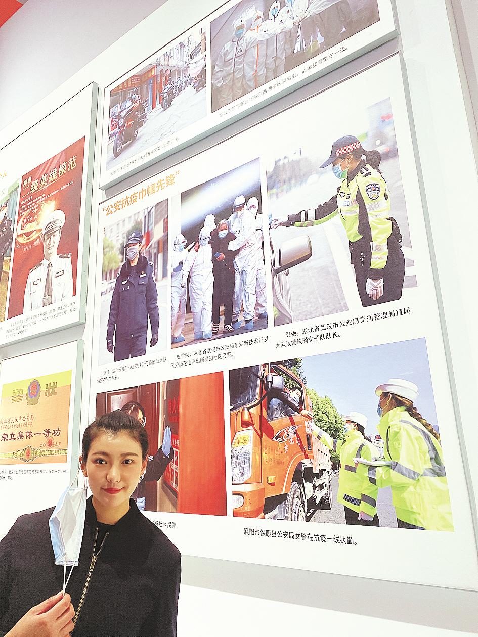“当时并没觉得怕,只是做了该做的事。”10月19日,在展厅“公安抗疫巾帼”版块,身穿警服的史雪荣,在自己的照片前,讲述照片背后的故事。