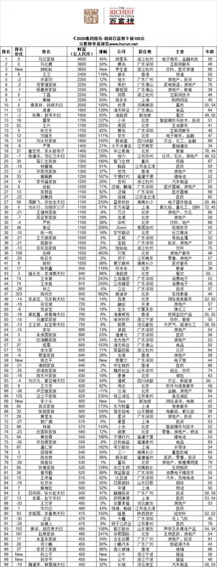 但在《2020胡润百富榜》中,56岁的马云财富增长1250亿,以4000亿元的身家依然位列中国首富。马化腾、钟睒睒分列榜单第二、第三名。