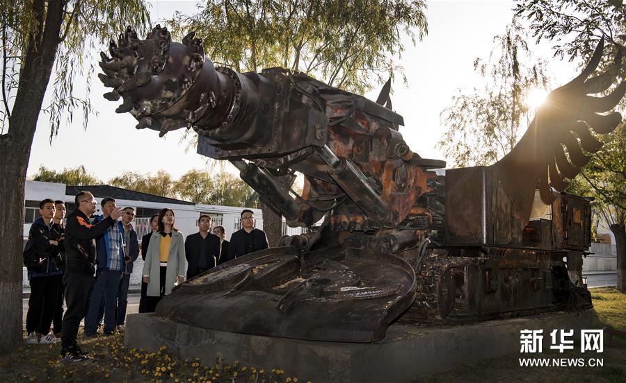 10月19日,游人在中能文创园原煤矿区参观原采煤设备改造的艺术雕塑。新华社记者 陶明 摄