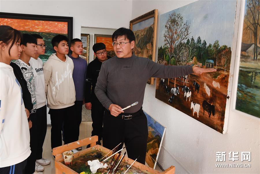 10月19日,驻园艺术家之一的画家韩亚平(右一)为前来观摩的美术爱好者讲解创作思路。新华社记者 陶明 摄
