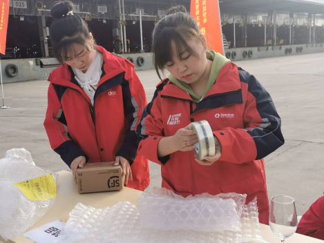 记者现场看到,活动桌台上纸箱里摆有打火机、固体胶、粉末物、红包、剪刀等20多种物品,要求选手在两分钟内在物品中找出哪些物品为违禁品、哪些只能通过陆运或航运;现场还有高脚杯、鸡蛋、手机等快递物品,快递员3分钟内对易碎和贵重物品进行打包,裁判将打包好鸡蛋和高脚杯两次扔在空中2米高落地,均未摔破。