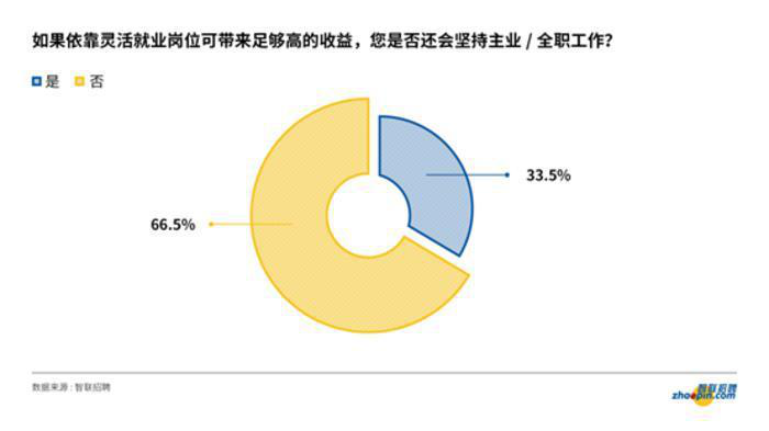 《报告》称,在企业招聘模式的转变下,期待一个人持续稳定工作已不那么现实。互联网平台上不再是单一的传统工作岗位,而是拥有多种可供求职者选择的简单零碎的任务。雇佣关系中的自主性吸引职场人在未来规划中作出灵活性调整。如收入可观,有66.5%的受访者愿意选择放弃主业/全职工作。