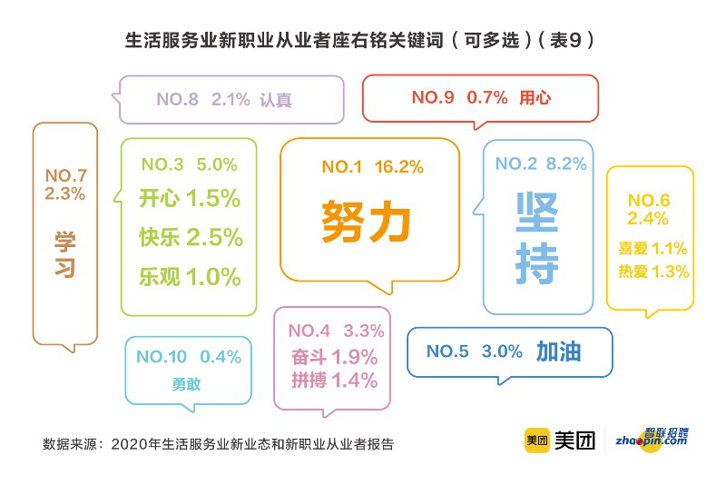 数据显示,新业态下的生活服务业新职业从业者呈现出以下特点:新职业从业者形成专业能力、爱好和收入的良性循环;人生态度进击性和乐观兼顾,16.2%的新职业从业者在座右铭中提到了“努力”。在典型人群洞察方面,仅美团平台上活跃商户的数字化运营人才需求总量就在279-558万人之间,岗位需求潜力大;新职业创业者拼搏进取、艰苦创业,61.2%的创业者的创业资金来自以前的积蓄。