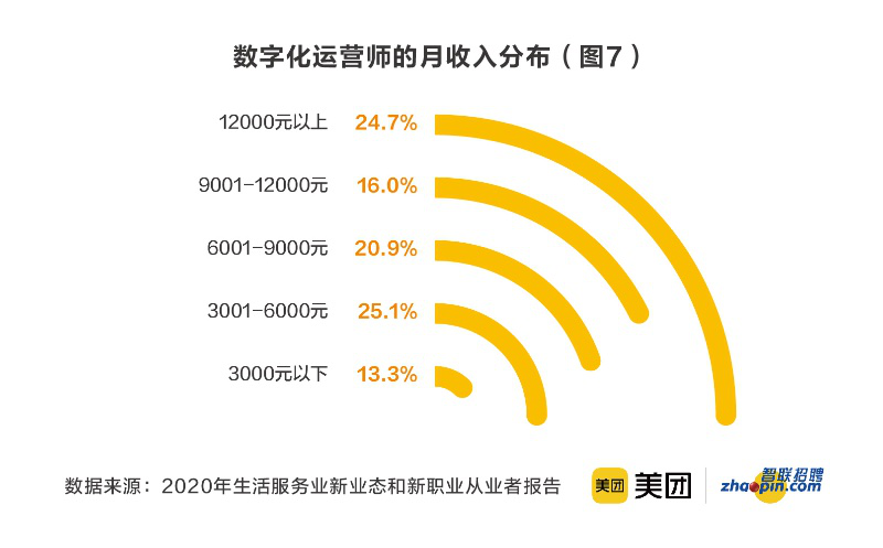 数字化运营师的收入较高。问卷调查显示,40.7%的从业者月收入高于9000元,24.7%的从业者月收入高于1.2万元。根据智联招聘大数据,2020年上半年生活服务业数字化运营师的平均月薪资达到9571元。其中,北京、深圳、上海的生活服务业数字化运营师的薪资位列全国前三,月收入分别达到12092元、12057元和11912元。