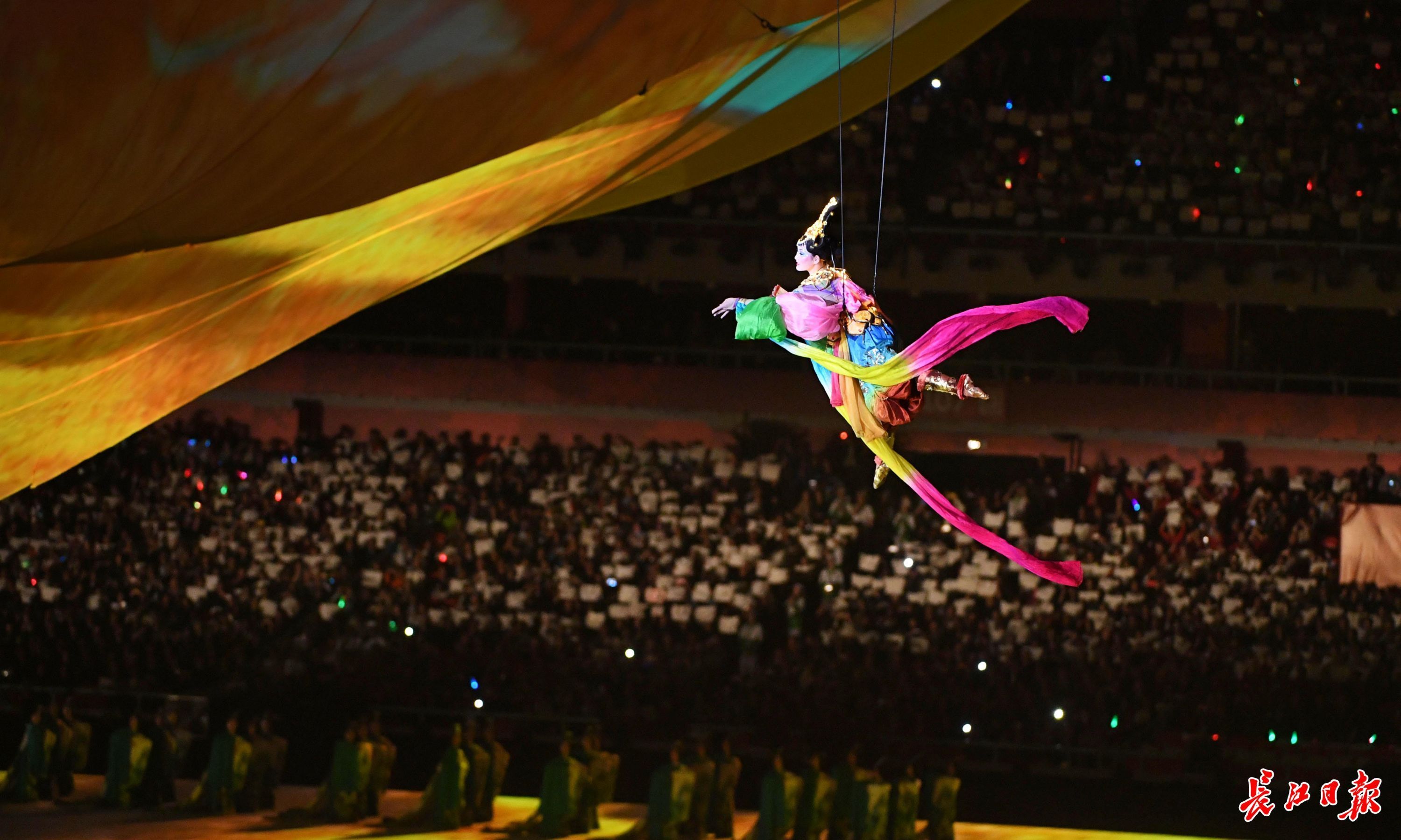 去年9月,第七届世界军人运动会在汉举行,全球目光聚焦武汉。武汉体育中心主体育场举办军运会开幕式,“空中舞台”上演《丝绸之路》,飞天仙女反弹琵琶凌空起舞,商人、驼队行走于“空中沙漠”,让观众大呼“美哭了”。