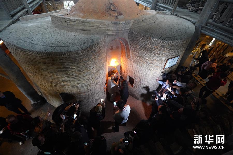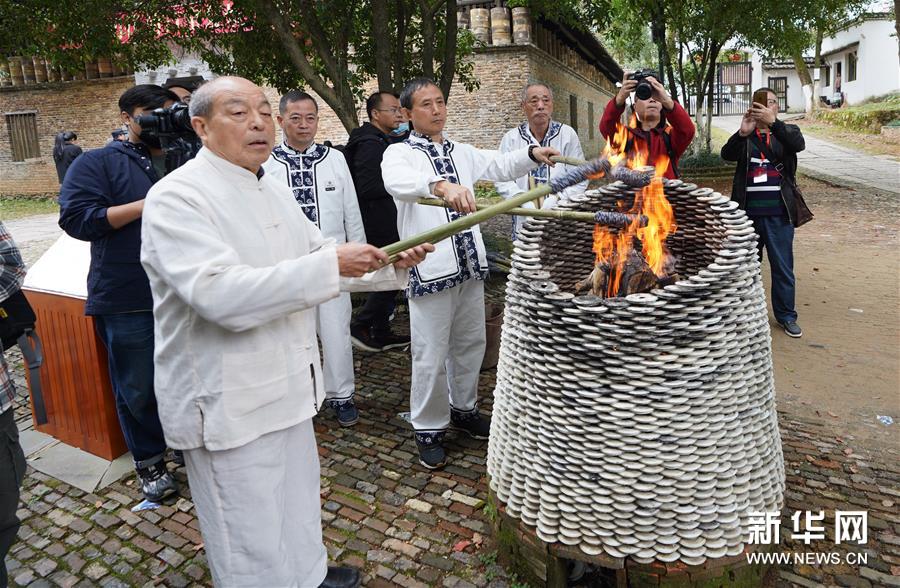 10月21日,与会嘉宾与把桩师傅胡家旺一起进行复烧点火。当日,作为2020中国景德镇国际陶瓷博览会的重要活动之一,景德镇古窑民俗博览区对重建的明代葫芦窑进行点火复烧。葫芦窑是盛行于元末和明代的重要瓷窑,此次有大批精品陶瓷将使用最传统的柴烧方式烧制。新华社记者 周密 摄