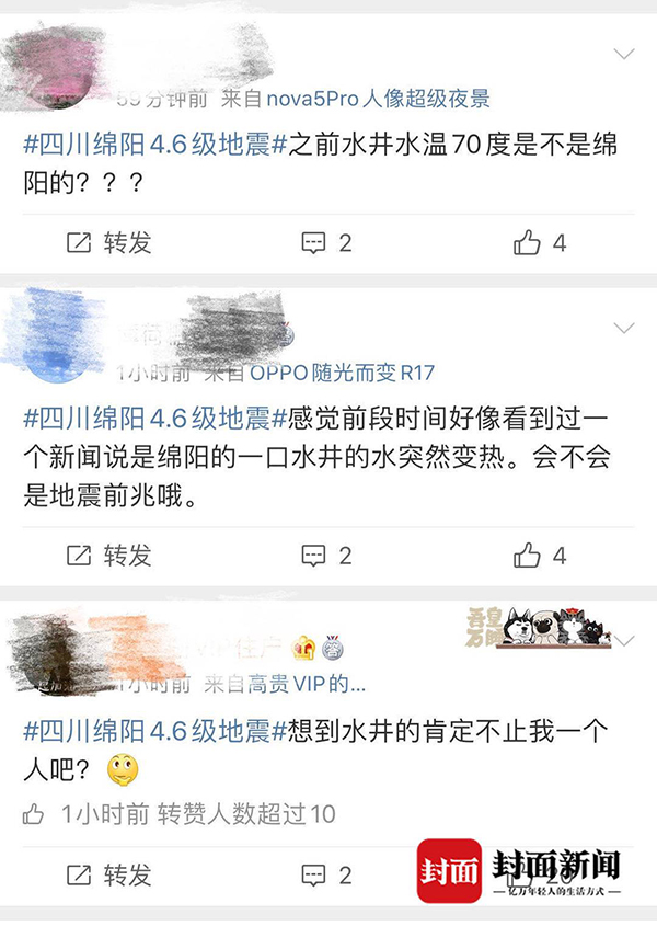 地震发生后,一些网友就由此联想到此前绵阳游仙区魏城镇一居民家后院的突然升温的水井。“想到水井的肯定不止我一个吧?”“感觉前段时间好像看到过一个新闻说是绵阳的一口水井的水突然变热。会不会是地震前兆哦。 ”
