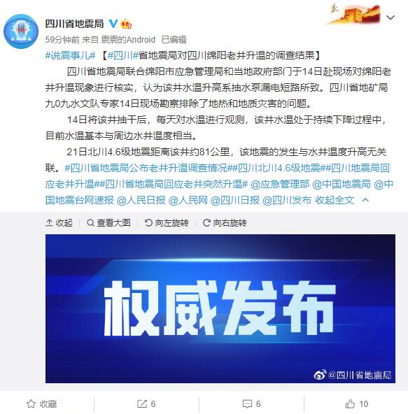 据四川省地震局官方微博消息,四川省地震局21日公布对四川绵阳老井升温的调查结果,认为该井水温升高系抽水泵漏电短路所致。21日北川4.6级地震距离该井约81公里,该地震的发生与水井温度升高无关联。