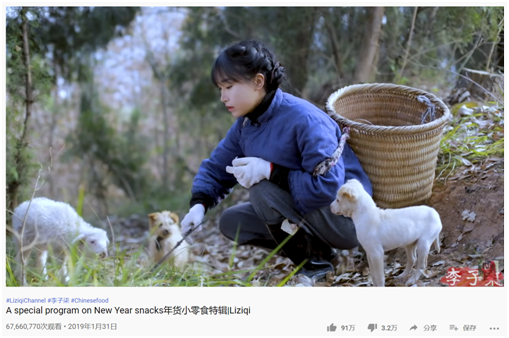 李子柒在油管上有1230万粉丝,单条视频的播放量基本都在1000万以上,最受欢迎的一条播放量已超6700万次,点赞过90万。