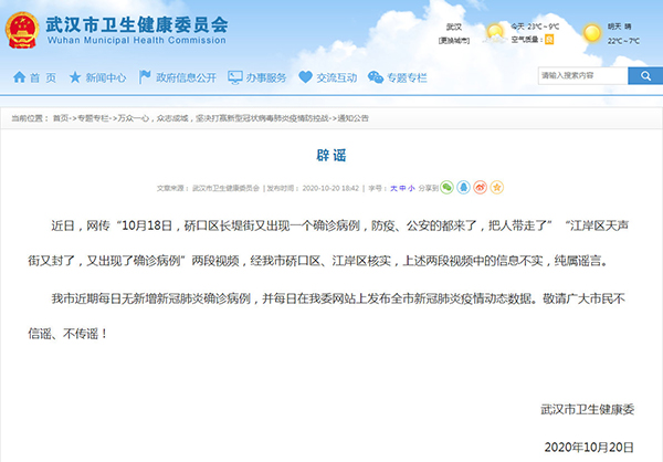 真相:网传“硚口区长堤街又出现一个确诊病例”“江岸区天声街又出现了确诊病例”的信息纯属谣言,武汉市近期无新增新冠肺炎确诊病例。武汉市卫健委每日在其网站上发布全市新冠肺炎疫情动态数据,请广大网民不信谣、不传谣,通过官方渠道获取信息。